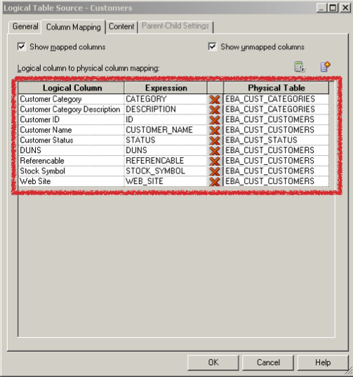 Once we have all the required tables joined into the logical table source, we can start mapping the physical columns to our desired logical columns, using either the Column Mapping tab in the logical table source, or by simply clicking and dragging physical columns over onto the logical dimension table.
