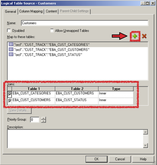 Thinking only about logical dimension tables for a moment, we start with the most basic and granular entity that composes the heart of the logical dimension, and start joining outward to include all the other ancillary entities needed to form a complete picture of that dimension. With the Customer Tracking application, the logical place to start is the Dim - Customer logical dimension, and the most basic table to use as a starting point is EBA_CUST_CUSTOMERS. This table contains the main attributes of Customer: the name, the address, etc. So I’ll construct a logical table source and start with the EBA_CUST_CUSTOMERS table, and then I’ll add additional physical entities using the (+) button, as depicted below.
