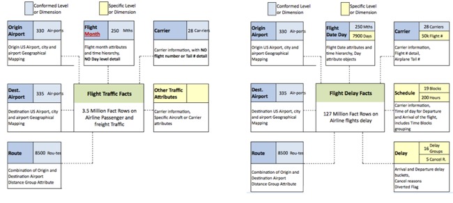 The flight delays dataset, once you look into it in more detail, really contains two main star schemas we're interested in; one based around a flight leg fact dimensioned by carrier, flight month, origin and destination airport, route and so forth. The other fact would be around the actual flight delays, sharing some of these dimensions but also with its actual reason for the delay, like the diagram below: