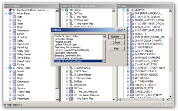This dimension model would then map fairly easily into an Oracle BI Repository semantic model, with a single data source and business model and with two subject areas, one for each star schema. As we're running on Exalytics though, we can then generate some aggregate recommendations, based either on database optimiser statistics (if the system is otherwise unused by end-users), or on actual query patterns taken from the usage tracking and summary statistics tables maintained by the BI Server. To generate these recommendations and then create a script for their implementation, you'd then use the Oracle BI Summary Advisor that's only available on Exalytics systems.