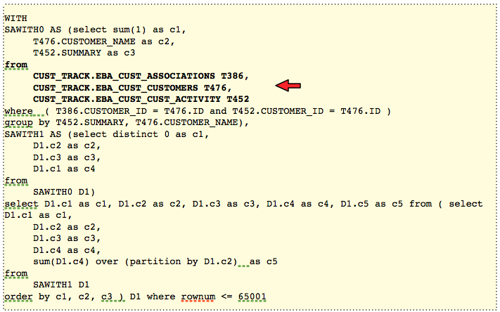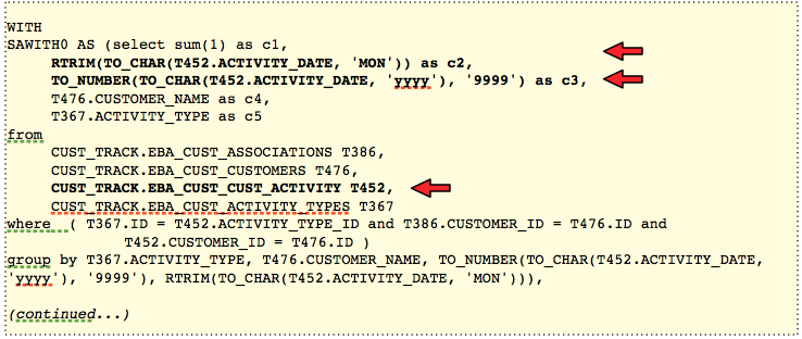 When we are all done with the BMM mapping, we can see how the BI Server generates the physical SQL against an Oracle Database. As we saw earlier, the BI Server doesn’t need to join to the EBA_CUST_CUST_ACTIVITY more than once, even though it’s now part of the logical table source for three logical tables: Dim - Customer Activity, Dim - Activity Date and Fact - Customer Activity.