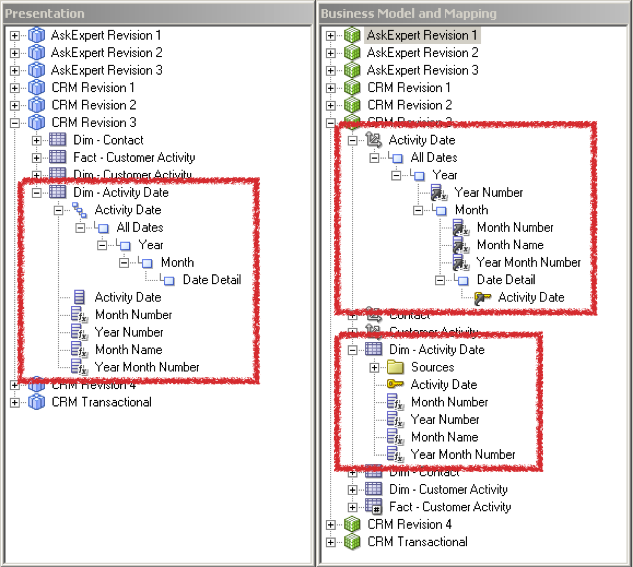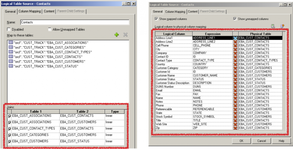 In the last post on Simple Dimensions and Facts, we discussed logical facts and dimensions, factless fact tables, and fake count measures. In constructing the simple dimension in that post, we saw the collapsing of normalized relationships into a single conformed dimension table when building Dim - Customer. Another important entity for reporting in the Customer Tracking application is the Contact entity. At first glance, it might seem that we should simply build another dimension called Dim - Contact, and use analyses to combine our Customer and Contact dimensions along with our Activity fact table to analyze Customer and Contact behavior. When we look again at the data model for the Customer Tracking application below, Customer and Contact are clearly two separate entities in this application, and so this probably means that we should continue to report on them this way, and structure them as such in the OBIEE Business Model and Mapping layer. Right?Is this the way that business users think about their data? Although it makes perfect sense in a normalized data model to have separate entities for Customer and Contact, the business user likely won't see it this way, especially when it comes to defining reporting requirements. Contacts are clearly specific instances of a Customer at a lower level in the Customer-Contact hierarchy, and our end users will expect to be able to drill cleanly from Customer on a report down to the specific Contact that is associated with a particular activity. Although OBIEE supports building hierarchies across multiple logical dimension tables so we can provide the drill-down behavior mentioned here, the end user is still confronted with two entities when building the report. This is perhaps the most challenging part of reporting against transactional schemas: deciding not to settle for the model that the OLTP designers have given us. Instead of resigning to have both Dim - Customer and Dim - Contact in our logical BMM, we should attempt to build the appropriate dimensional rendering of this model: a single Dim - Contact dimension of which Customer is simply another element in the hierarchy.