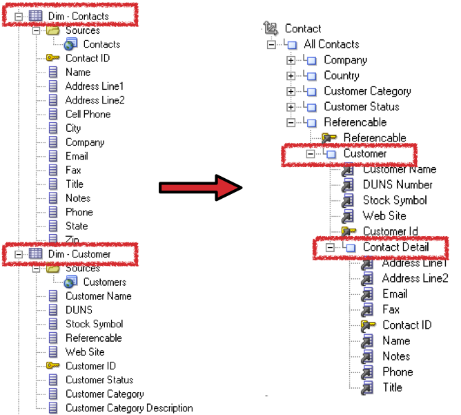 I consider this merging of entities into a single logical dimension table to be more profound than our original constructing of Dim - Customer in the Simple Fact and Dimension post. Although we combined multiple normalized tables to get our original Customer dimension, those tables represented labels and descriptors, such as Customer Category and Customer Status. They didn’t represent true entities, which I argue is the distinction that exists when combining Customer and Contact. This type of high-level distinction comes into play when we try to think about our source model in dimensional terms instead of transactional ones.