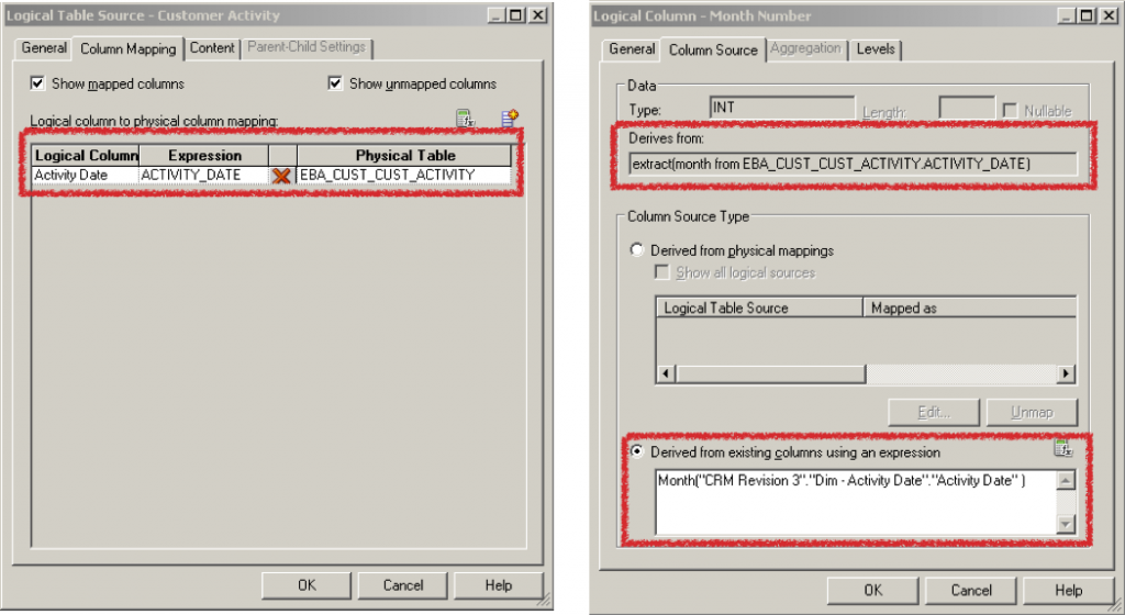Though it's tempting to dive into the first bullet point further (feel free to leave comments about this), it seems like a fairly standard approach for developers familiar with using OBIEE against traditional data warehouses. We will instead focus on the second bullet point: constructing a date dimension out of sheer nothingness. We start by building an empty dimension table called Dim - Activity Date and mapping only one single attribute from our source table containing the DATE column, in this case, EBA_CUST_CUST_ACTIVITY.ACTIVITY_DATE. This will be the only attribute that we map back to a source table; all the remaining attributes will be calculated measures in the BMM. The OBIEE SQL language contains a series of date conversion functions specifically designed to extract date elements from a DATE datatype. Any functions that OBIEE can’t extract on it’s own can be extracted using the EVALUATE function to push database-specific syntax transparently down to the underlying database engine. I prefer to use the logical option Derived from existing columns using an expression as opposed to Derived from physical mappings whenever possible because we can reuse the Dim - Activity Date dimension with other facts, and we will only have to map a single column in the logical table source: the DATE attribute.