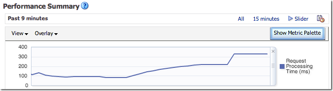 - Through Fusion Middleware Control, under Capacity Management -> Metrics -> View the full set of system metrics. This gives a point-in-time view of the data for the last 15 minutes, and does not store history.