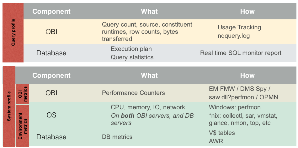 - Environment metrics - everything outside OBI - the host OS, the database, the database OS.