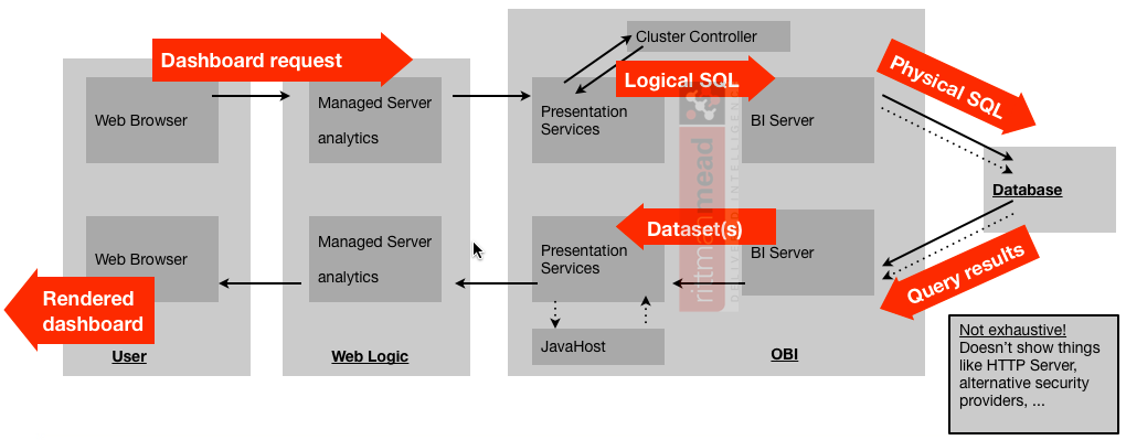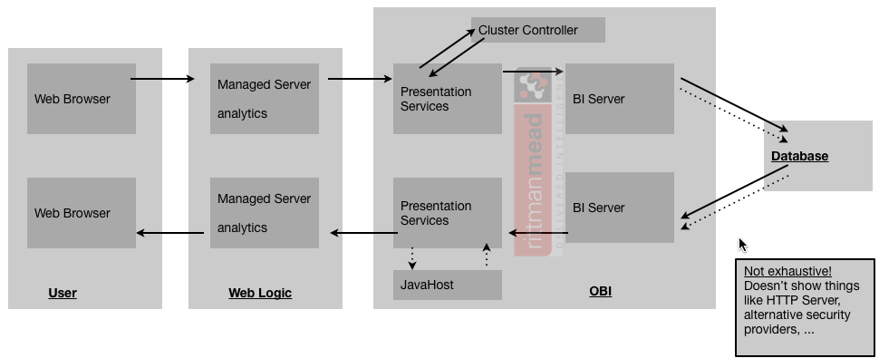 When the user interacts with OBI all the web browser calls are done through WebLogic. WebLogic runs Java deployments including one called analytics which communicates with the Presentation Services OBI component. When the user requests a dashboard, the following happens: