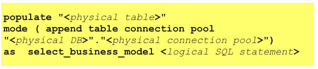 This populate <table> command can be sent by us directly to the BI Server (exactly in the way that a standard create aggregate Aggregate Persistence script would be - with nqcmd etc) and causes it to load the specified table (using the specified connection pool) using the logical SQL given. The re-creation of the aggregate tables, and the RPD mapping, doesn't get run: