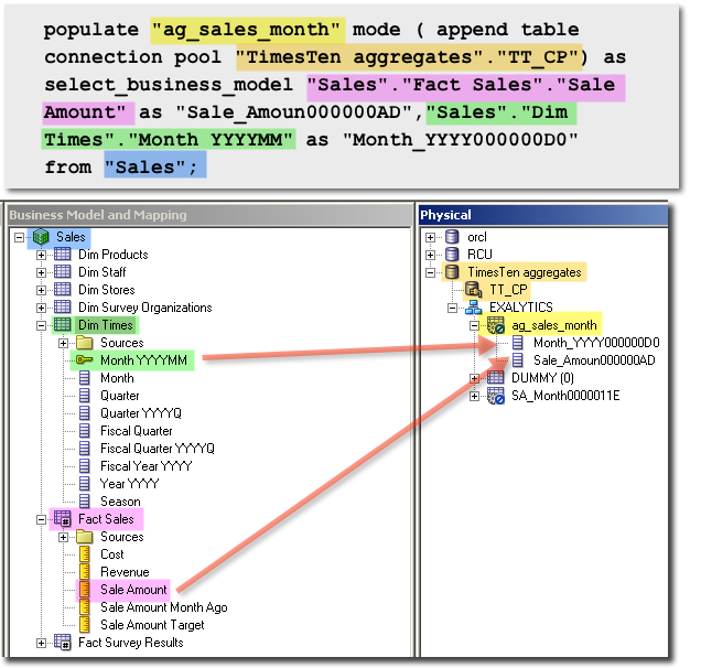 - Loading TimesTen aggregates directly using TimesTen’s Load from Oracle functionality, taking advantage of Aggregate Persistence to do the aggregate mapping work in the RPD