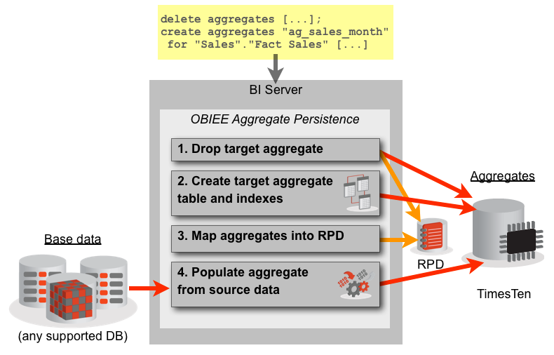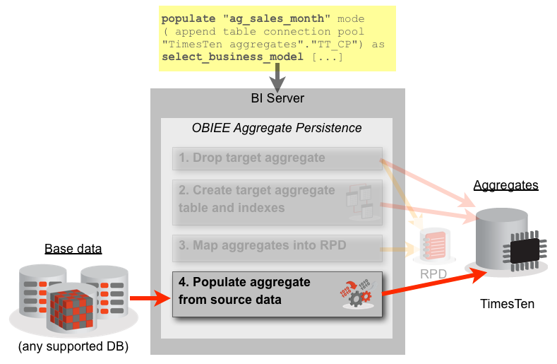 - Populate the aggregate tables, from source via the BI Server to the aggregate target (TimesTen)