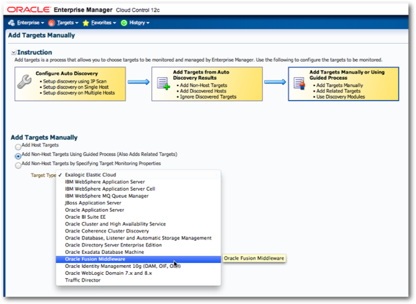 So at this point the management agent software will be deployed to the server, but none of the WebLogic, database or BI software will be registered with EM yet. To do this, on the screen that's again displayed after you've registered the host itself, select Add Non-Host Targets using Guided Process (Also Adds Related Targets) option, then from the Target Type drop-down menu select Oracle Fusion Middleware, and then press the Add Using Guided Discovery… button to start the process by registering the WebLogic installation which in turn hosts OBIEE 11g.