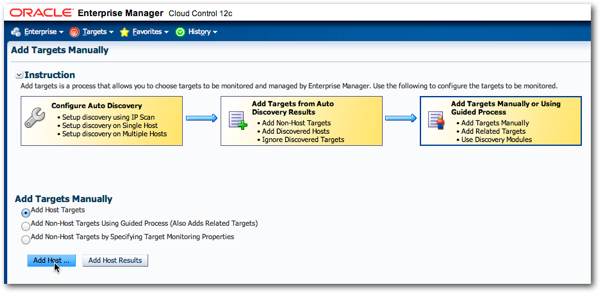 The Add Targets Manually page is then displayed. I select Add Host Targets from the set of radio button options, and then press the Add Host … button.