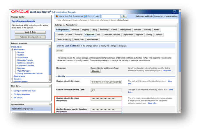 Secondly, go to the WebLogic Administration console. For the current server, enter the SSL passphrase in the key-stores and SSL configuration page, and then restart the server from the control page.