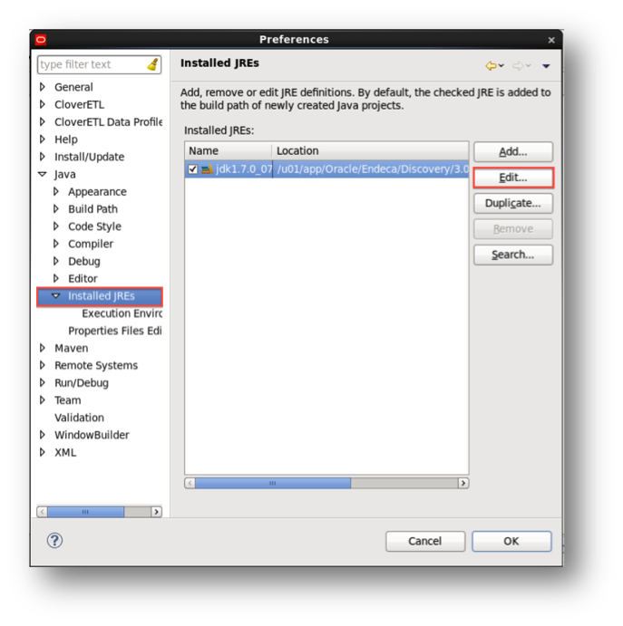 - JRE Configuration, Same variables should be added to the Integrator designer JRE. To do so open clover Preferences on Window menu. Under Java> Installed JREs select the available jdk and click Edit. Add same option to ‘Default VM arguments’ and Finish the edit.
