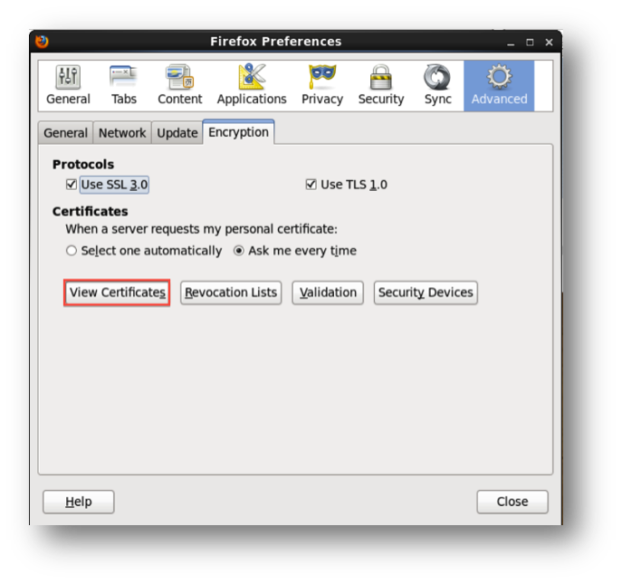 Open your browser and go to its preferences page. Go to Advanced > Encryption tab and click on ‘view certificates’. This is the place that you will need to import the generated esClientCert.p12 file and private passphrase to.