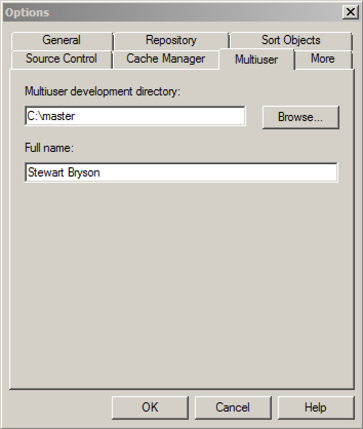 Once we have configured one or more projects in the repository, we then take the binary RPD file and place it on a network share accessible to all developers. From here on out, the RPD file is referred to as the Master Repository. Now, whenever we want to check out a project from the Master Repository, we register the shared network drive location in the Admin Tool. We get to the configuration screen by choosing Tools and then Options... and then choosing the Multiuser tab: