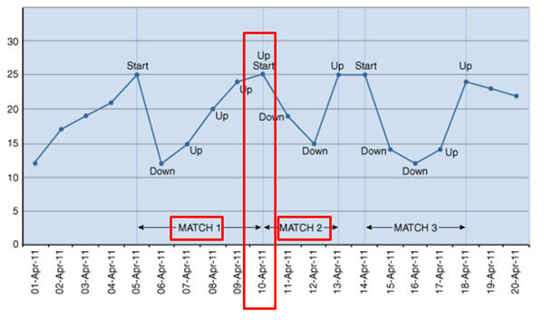 would look for patterns of rows that featured a "v-shaped" up-and-then-down movement, such as that shown in the graph below, that might be useful in identifying stock disposals around a key date.