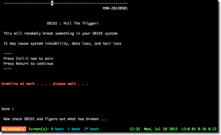 Put your OBIEE sysadmin skills to the test with this nifty little script. Set it up with yourFMW_HOME details (no peeking at the rest of the script!) and then run it. It will take a random action that breaks something on your OBIEE system, and it’s your job to figure out what.