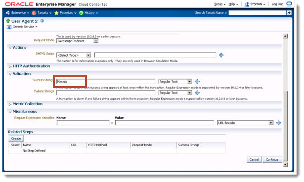 Back in the Enterprise Manager browser window, it should have recorded the login steps which should look similar to the screenshot below. Click Continue to proceed