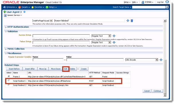 So our first task is change the User Agent that this service is running as. Return back to the Service Tests and Beacon page and ensure OBIEE login is selected and click Edit
