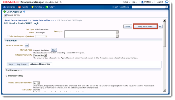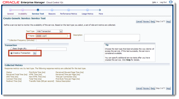 The Service Test step is where we can define our Web Transaction. Type in a name for the test, for example "OBIEE Login", and then select Create a Transaction and click Go.