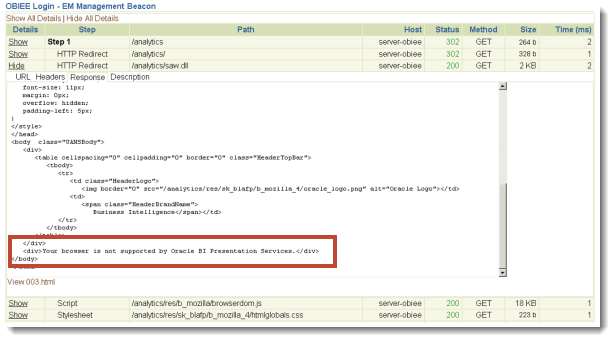 When examining the steps, one thing I notice is that OBIEE's presentation services is complaining about the browser version...