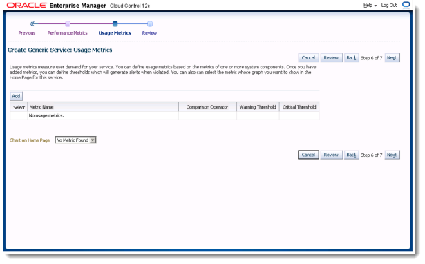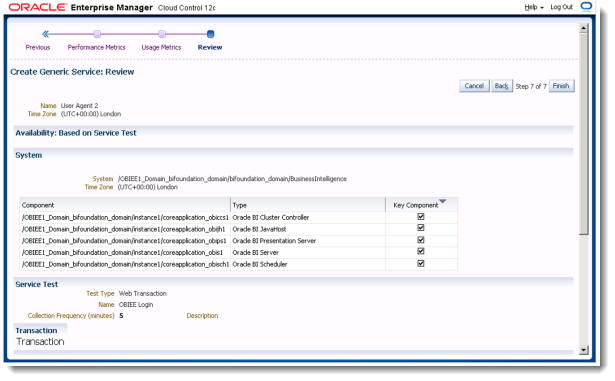 The Usage Metrics step is where we can associate metrics to this service test. For example if you have a few sessions initialised that could affect the login times to Oracle BI, it might be worth monitoring the connection pool usage to ensure that it’s not over used.
