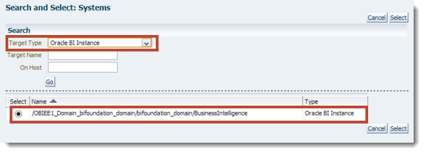 Click Select System and select the Target Type: Oracle BI Instance, then press Select.