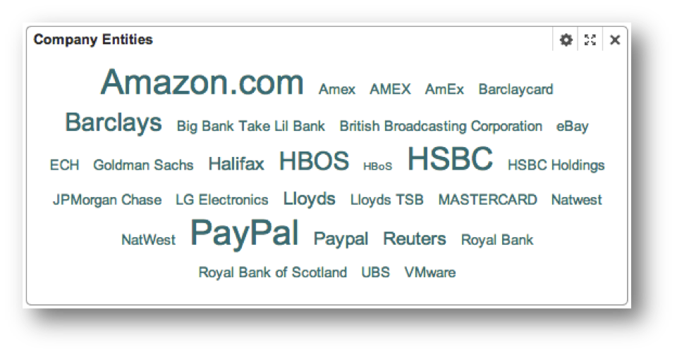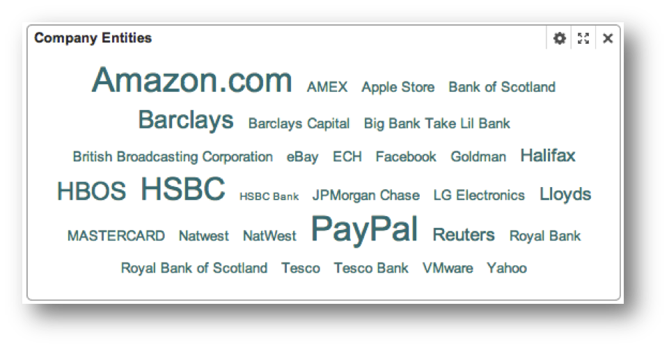 The component within Endeca Information Discovery that extracted the bank names from the data feed is called the “text enrichment engine”, which actually uses technology that Oracle license from a company called Lexalytics. When you use the text enrichment engine, one of the things it does is to extract “entities” such as people, companies, products, places, email addresses and dates, along with themes and any quotations mentioned in the text.