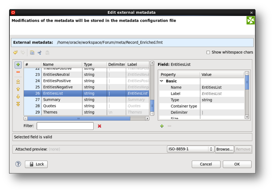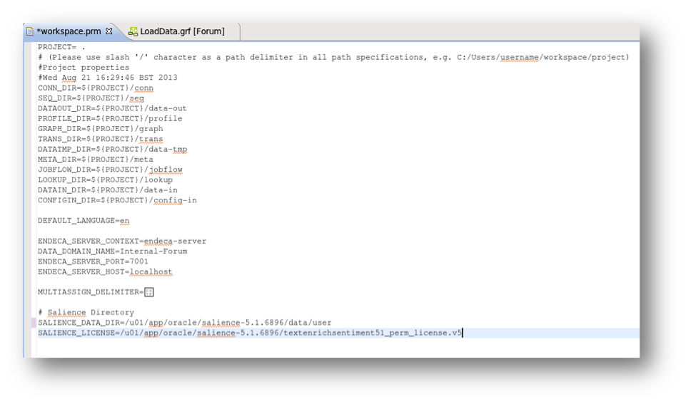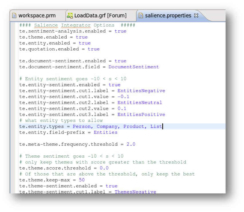 3. Update the Salience.properties file within Oracle Endeca Information Discovery ETL tool, Integrator designer. By default the property “te.entity.types” contains Company, Person, Place, Product, Sports and Title. Add “List” to include user-defined entities.