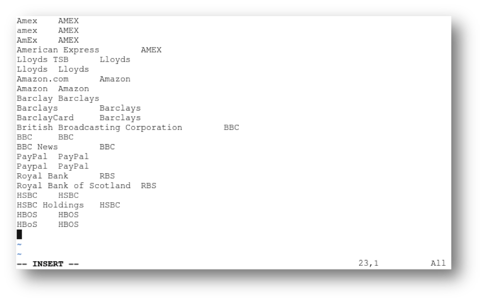 In some circumstances you will want to create a new list based on the application that you are working on. An example related to the displayed image is a list of all bank or financial institutes and their acronyms. It could be the case that we want to exclude company names that are not related to banking, rather than as shown in the image above where Amazon appears for example.
