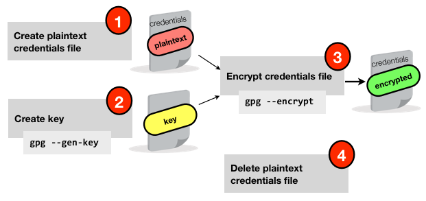 This is a one-time set up activity. We create a key in gpg, and then encrypt the plain text credentials file using it.