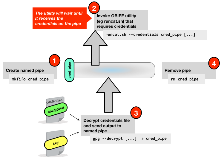 gpgto decrypt the credentials file, and pass the decrypted contents to the named pipe. The OBIEE utility is already running and listening on the named pipe, so will receive (and remove from the pipe) the credentials as soon as they are passed fromgpg.