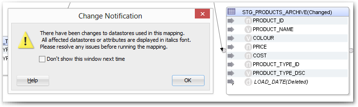 It will not happen anymore with 12c. Now, you can change it in the model and a change notification will be displayed in every mapping using this datastore. In the following example, I removed the LOAD_DATE column.