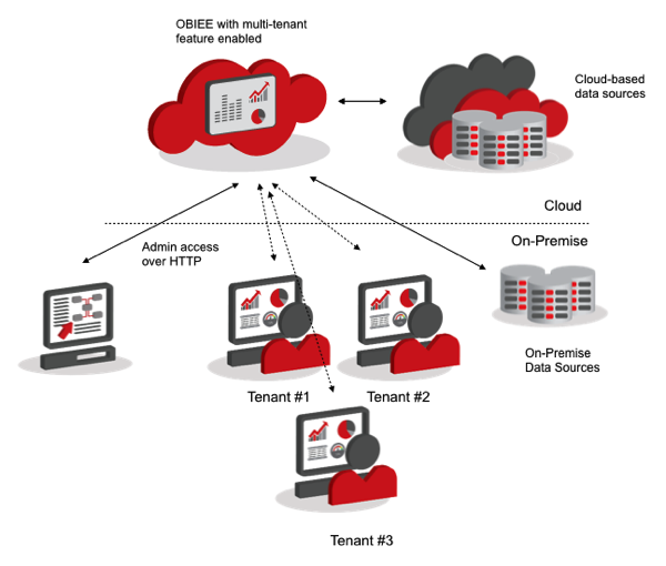 The other third-party approach to this centres around multi-tenancy; typically, a partner or company will provide a reporting or analytics element to a wider product set, and use OBIEE as its embedded dashboarding tool as part of this. In the past, setting up multi-tenancy for OBIEE was fairly difficult, to the point where most companies set up separate installs for each end-customer, but 11.1.1.7 brought a number of multi-tenant features that presumably were put there to support Oracle’s own cloud product. The product docs describe the new multi-tenant features well, but the basic premise is that a single RPD and catalog are still set up, but OBIEE can then run in a “multi-tenant” mode where GUIDs demarcate each tenant, a new BIGlobalAdministrator role is created that assumes what were the old BIAdministrator role’s privileges, with other administrator roles then set up with limited privileges and no access to Fusion Middleware Control, for example.