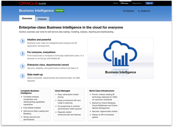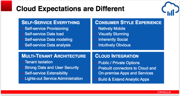 Whilst the underlying technology is core OBIEE, it’s designed for departmental, power user-type scenarios where the scope of data is limited, and the focus really is on ease-of-use, self-service and “software-as-a-service”. Looking at Oracle’s slides from Openworld, you can see the focus is quite different to on-premise OBIEE - the competition here for Oracle is the various internet startups, and products like Tableau, that make it easy to get started, provide consumer-class user interfaces, and focus on the single user rather than enterprise-type requirements.