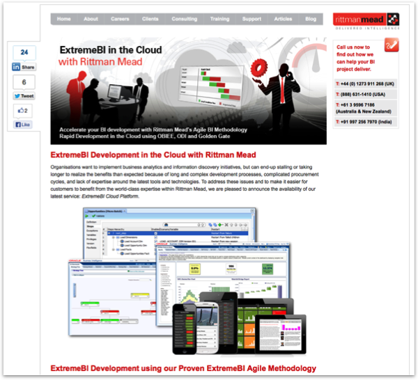 The third major variant that I can see around OBIEE in the cloud, is where partners (such as Rittman Mead) offer shared access to their cloud OBIEE installations, either as part of a development package or through some sort of multi-tenant reporting product. For example, we’re about to launch a service we’re calling “ExtremeBI in the Cloud”, where we combine our “ExtremeBI” agile development method with cloud-based development server hosting, with the cloud element there to make it easier for clients to start on a project today. Endeca Information Discovery is another product that could benefit from this approach, as the infrastructure behind an Endeca install can be fairly substantial, but users are typically more-focused on the data modelling and report-building element. In our case, the back-end cloud hosting will typically be done on a service like Amazon EC2 or VMWare’s Hybrid Cloud product, but the focus is more on the development piece - cloud is there to provide business agility.