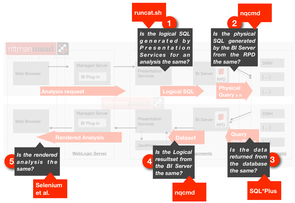 Looking back at the diagram from the first post in this series, you can see the opportunities for regression testing in the OBIEE stack, with the point being that a clear comprehension of this would allow one to accurately target testing, rather than assuming that it must take place at the front end: