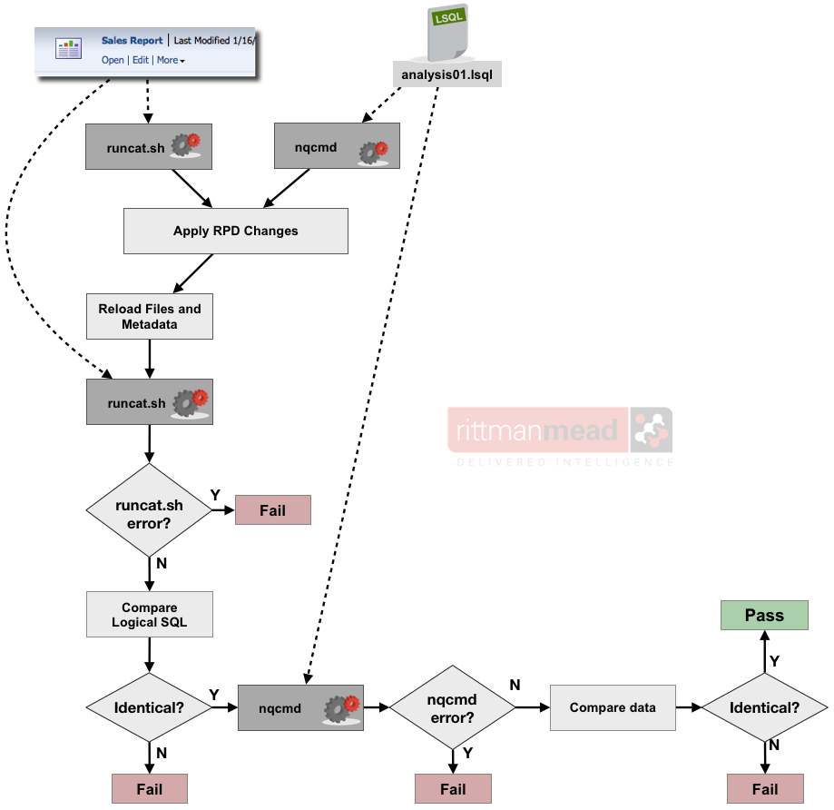 There are at least two ways to get the Logical SQL for an analysis programatically : the generateReportSQL web service, and the Presentation Services Catalog Manager tool. We will look at the latter option here. The Catalog Manager can be run interactively through a GUI, or from the command line. As a command line utility it offers a rich set of tools for working with objects in the Presentation Catalog, including generating the Logical SQL for a given analysis. The logical outline for using it would be as shown below. If the Logical SQL is not identical, or runcat.sh fails to generate Logical SQL for the analysis after the RPD is changed, then a regression has occurred. If the Logical SQL has remained the same then the testing can proceed to the nqcmd method to compare resulting datasets.