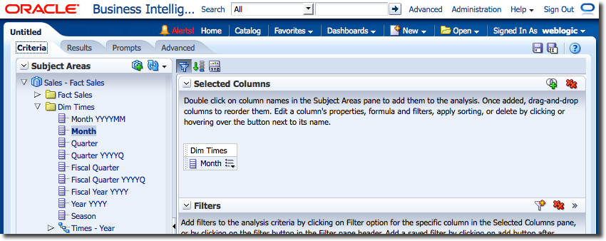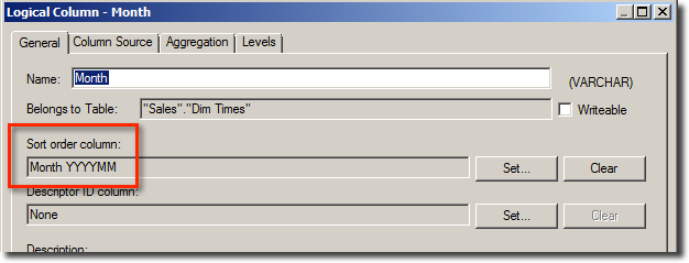 The same happens with the Descriptor ID Column setting for a Logical Column – the generated Logical SQL will change if this is modified. Changes to Logical Dimensions can also affect the Logical SQL that is generated if an analysis is using hierarchical columns. For example, if the report has a hierarchical column expanded down one level, and that level is then deleted from the logical dimension in the RPD, the analysis will instead show the next level down when next run.