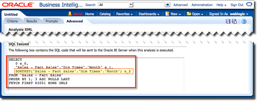 Reload the RPD in Presentation Services (Reload Files and Metadata) and reload the analysis and examine the Logical SQL. Even though we have not changed the analysis at all, the Logical SQL has changed: