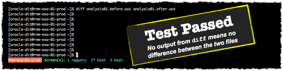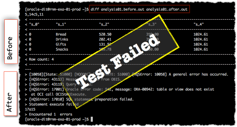 md5and store just the hash of each resultset, making for faster comparisons. The drawback of this approach would be that to examine any discrepancies you’d need to rerun both the before & after tests. There is also the theoretical risk of a hash collision (where the same hash is generated for two non-matching datasets) to be aware of. diffsets a shell return code depending on whether there is a difference in the data (RC=1) or not (RC=0), which makes it handy for scripting into if/then/else shell script statementsnqcmdusesstdoutandstderr, so instead of specifying-ofor an output file, you can redirect the output of the Logical SQL for each analysis to a results file (file descriptor 1) and an error file (file descriptor 2), making spotting errors easier:nqcmd -d AnalyticsWeb -u weblogic -p Password01 -s analysis01.lsql 1>analysis01.out 2>analysis01.err