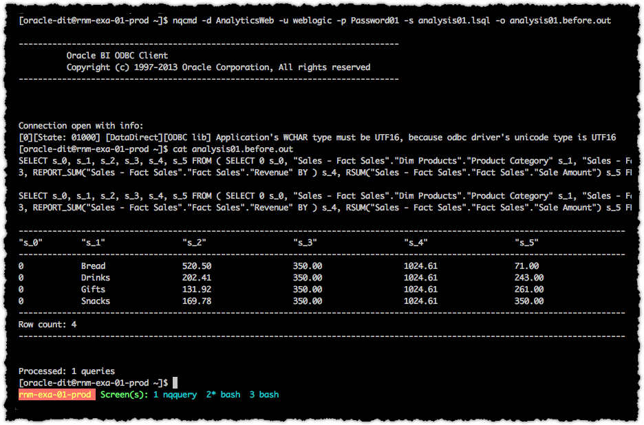 nqcmd -d AnalyticsWeb -u weblogic -p Password01 -s analysis01.lsql -o analysis01.before.csv