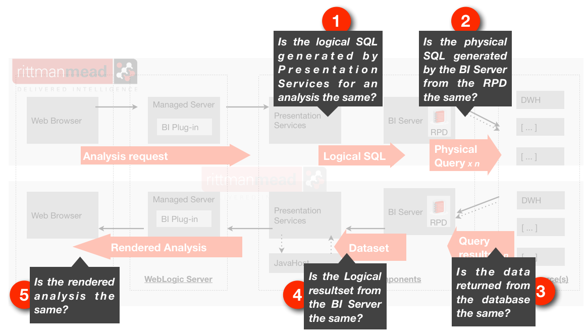 - The Physical SQL is dependant on the RPD; if the RPD changes then the Physical SQL may change. However, if neither the RPD nor inbound Logical SQL has changed and only the underlying data source has changed (for example, a schema modification or database migration) then we can ignore the OBIEE stack itself and simply test the results of the Physical SQL statement(s) associated with the analysis/dashboard in question and make sure that the same data is being returned before and after the change