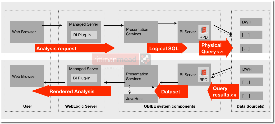 Looking at the following diagram of a request/response through the OBIEE stack we can see that so far as data is concerned, it is the BI Server doing all the work, handling both logical and physical SQL and data sets: