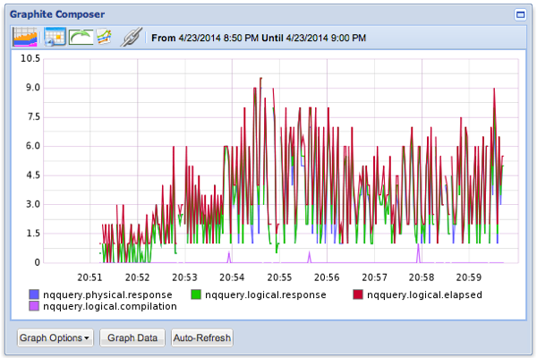Now I run this script, it scrapes the data out of nqquery.log and sends it to Carbon, from where I can render it in Graphite: