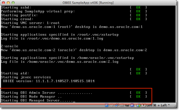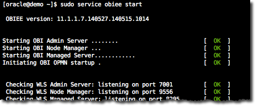 So to make OBIEE start automatically, the first thing we need to do is make sure that the database (where the RCU schemas are) is doing the same, by setting it up as a service (init.d). This is based on this article if you want more details about quite how it works, but for know you just need to copy and paste this whole code block into the command prompt on SampleApp to create the necessary files. If you can't copy & paste between your host and the Virtualbox guest, just go to this blog from Firefox within the SampleApp VM itself.