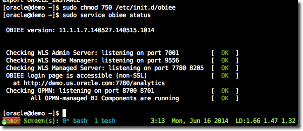 Now we can set up OBIEE as a service that can start automatically at boot time. This is using a script that I wrote and is shared on the Rittman Mead public scripts github repository here: http://ritt.md/init.d. To install it on SampleApp v406 needs a couple of changes for the environment paths and dependencies etc, which I’ve incorporated in this code block. Again, copy and paste the whole thing into a command prompt on SampleApp.