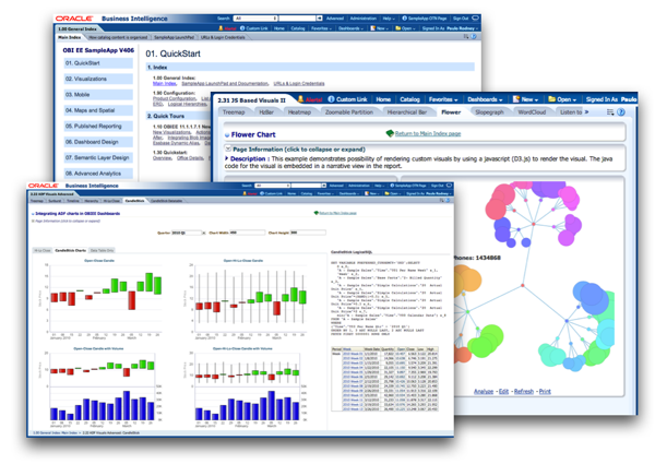 Last week Oracle released v406 of SampleApp. SampleApp is a one-stop-shop for a demonstration of pretty much any conceivable thing that OBIEE is capable of, and then some more on top of it. It is a VirtualBox appliance with everything on the one machine (Database, OBIEE, Endeca, TimesTen, Essbase, etc), and demonstrates basic analysis building techniques through to dashboarding, Mobile App Designer, analysis visualisations with D3, ADF, JavaScript, backend hackery with undocumented NQS calls (hi Christian!), and much, much more.