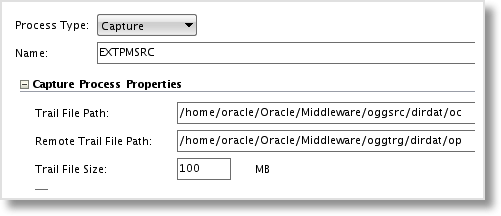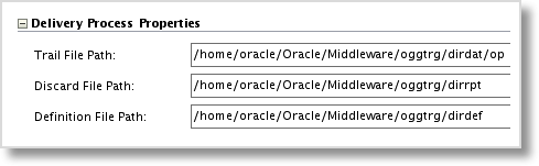 For the target, or replicat, process group, perform the same actions on the GoldenGate target Data Server. This time, we just need to specify the target trail file directory, the discard directory (where GoldenGate reporting and discarded records will be stored), and the source definitions directory. The source definitions file is a GoldenGate representation of the source table structure, used when the source and target table structures do not match. The Online JKM will create and place this file in the source definitions directory.